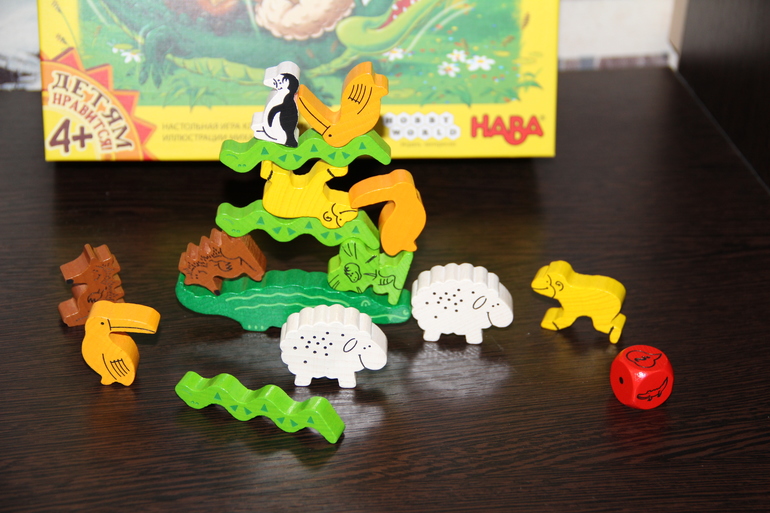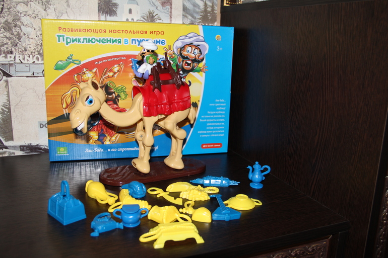 Как и повар и все описанные игры выше выпускаются у разных производителей под разными названиями, а содержимое по-моему не отличается. Эту игру давно не доставали, т. к. в детстве мой старший её очень испугался, сейчас надо дать ей второй шанс. Али-Баба усаживается на верблюда и начинает его потихоньку нагружать различным товаром (усадить верблюда без проблем может только мой муж, я пока так и не научилась, какой-то он тугой). Игроки по очереди берут карточки и развешивают на верблюда товар, который изображен на карте, но верблюд в любой момент может взбрыкнуть и раскидать все по сторонам. В чей ход верблюд вскочил на ноги, тот проигрывает сразу, остальные игроки считают очки на своих картах, которые они получили при погрузке и у кого больше тот считается победителем.