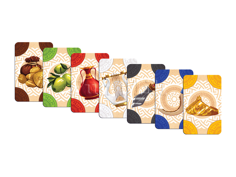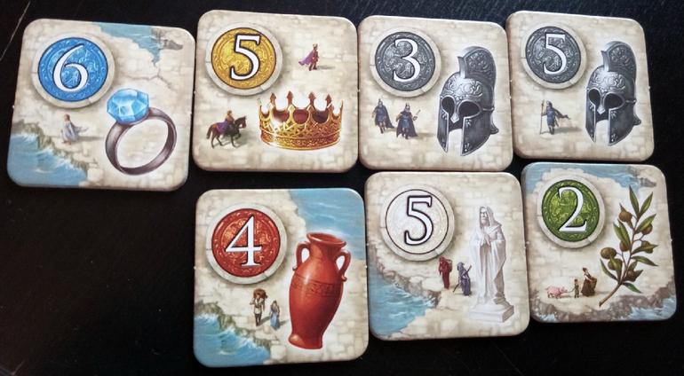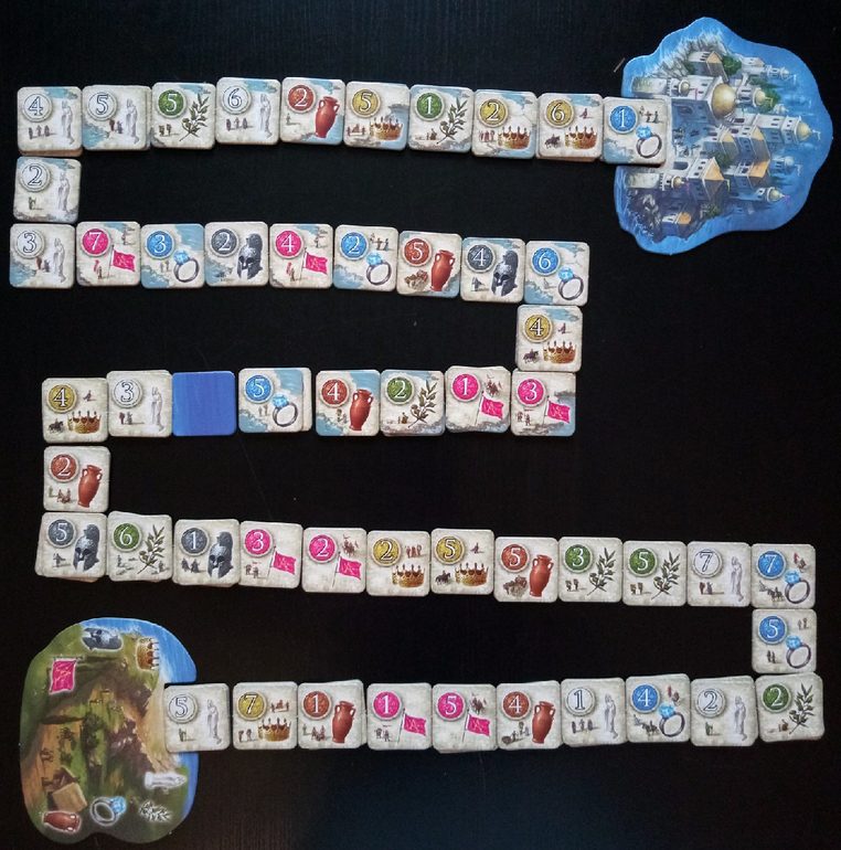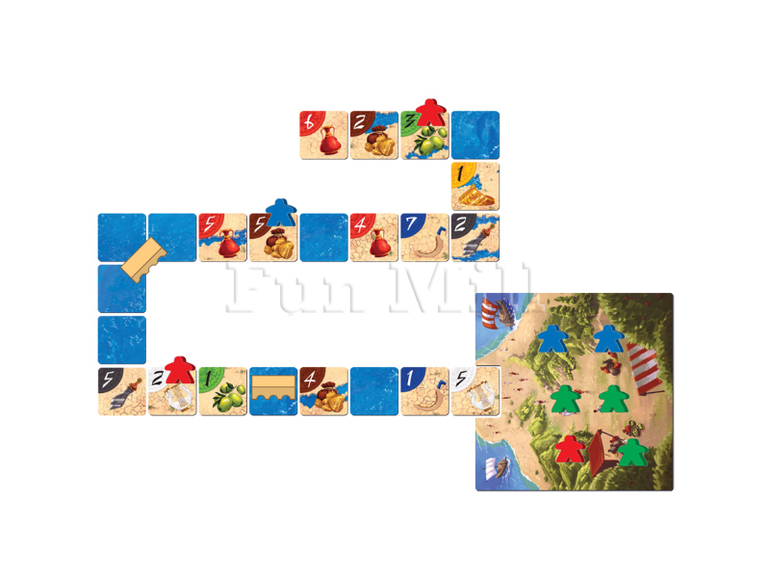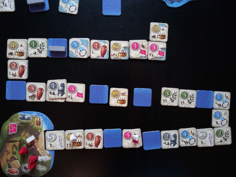 У каждого игрока есть один мост (вот он серый на снимке), который можно пристроить на любое место по вашему выбору. Теперь через эту водную преграду любой мипл (будь то ваш или вашего соперника) пройдёт бесплатно. За остальные же "дыры" надо платить (видимо, не все беженцы надеются заработать подбирая с земли что плохо лежит, некоторые подрабатывают лодочниками). Чтобы узнать цену переправы - смотрите на два тайла расположенные по обеим сторонам и выбирайте тот, что с минимальной ценность. Расплатиться вы должны будете заранее, из тех тайлов, которые награбили до этого. Сдачи в этой игре не предусмотрено (да и какая может быть сдача, если клиент расплачивается не деньгами, а статуэтками и амфорами), так что в ваших интересах иметь сокровища разной ценности.