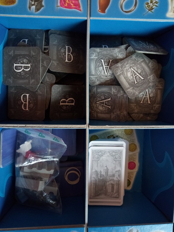 Как и в любых евро, подготовка к игре здесь начинается с долгого и муторного расклада компонентов на свои места. Видите в коробочке тайлы и буквами А и В?