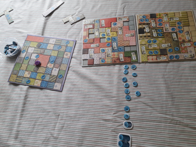 "Как бы взять получше" - второе отличие. В "Листопаде" большое количество разных тайлов, поэтому даже опцией "украсть тайл у соперника" иногда нет смысла пользоваться. На общей тропе есть из чего выбрать. В "Пэчворке" ограниченный набор тайлов. Не знаю, как у остальных, но у меня сын готов бросаться грудью на тайлы с 3 пуговицами, лишь бы не позволить их купить. Потому что это-победные очки.