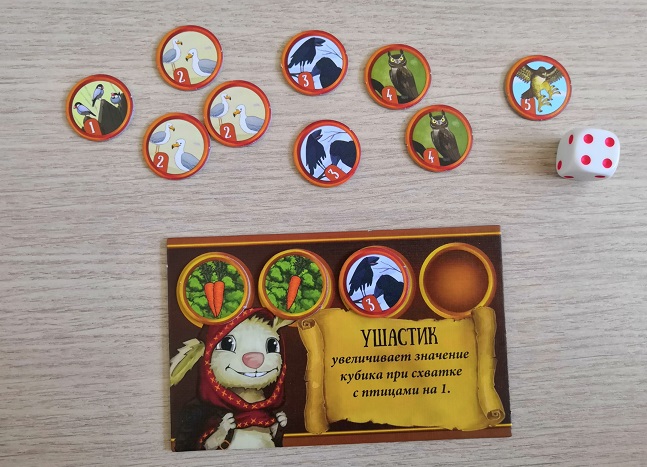 Значение птиц от 1 до 5. Значение на кубиках от 1 до 4. Чувствуете подвох? Как может маленький зайчонок напугать орла? Только один Ушастик знает секрет! И то он не всегда его спасает. На фото видно, что Ушастик не смог справится с обычной вороной.