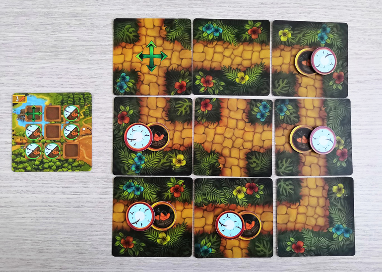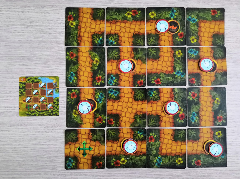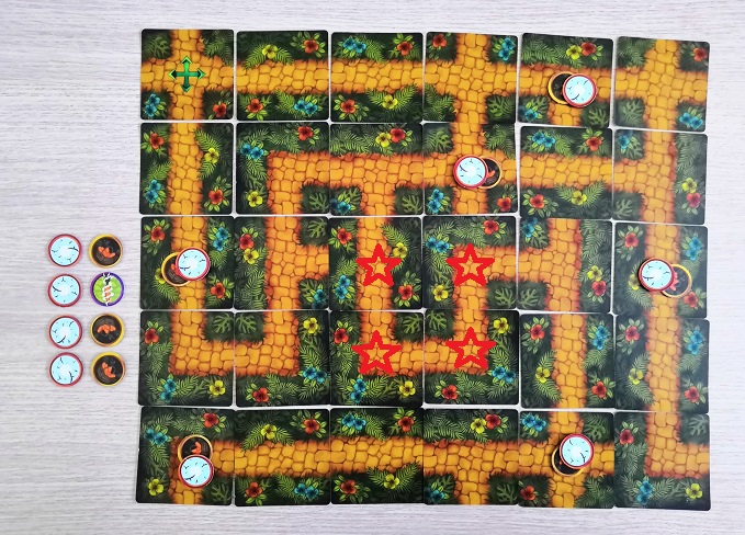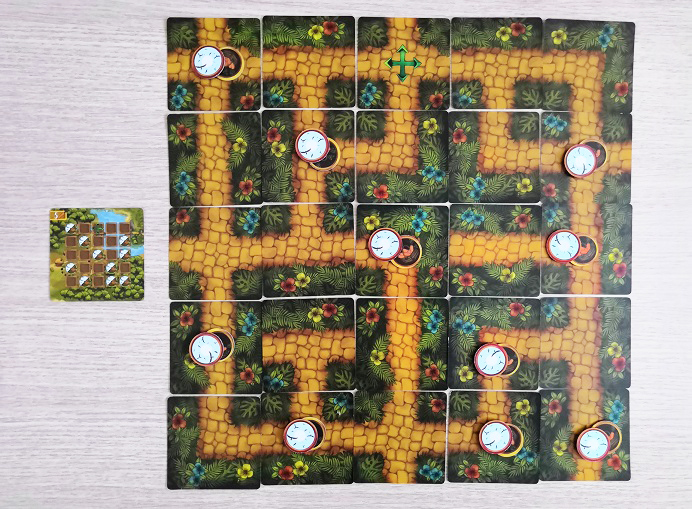 Открывается карта приключения, на стол выкладывается карта с крестиком - это выход из лабиринта и переворачиваются часы.... За 1 минуту игрокам всем вместе нужно построить один лабиринт.