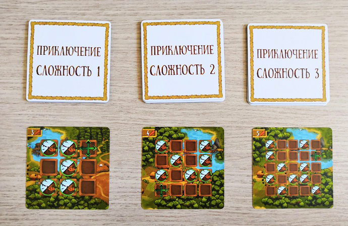 Когда зайчат разобрали, делим стопку приключений на три уровня сложности. За игру нужно пройти три приключения: по одну из каждого уровня.