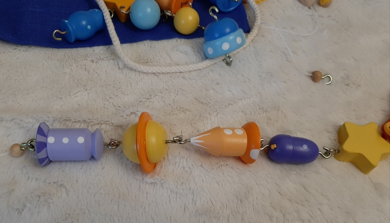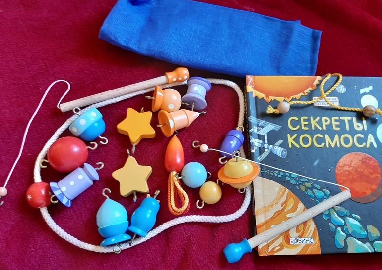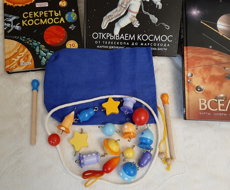 В наборе две деревянные удочки, веревочный ограничитель, 15 космических объектов и чудесный небесно-синий льняной мешочек для хранения.