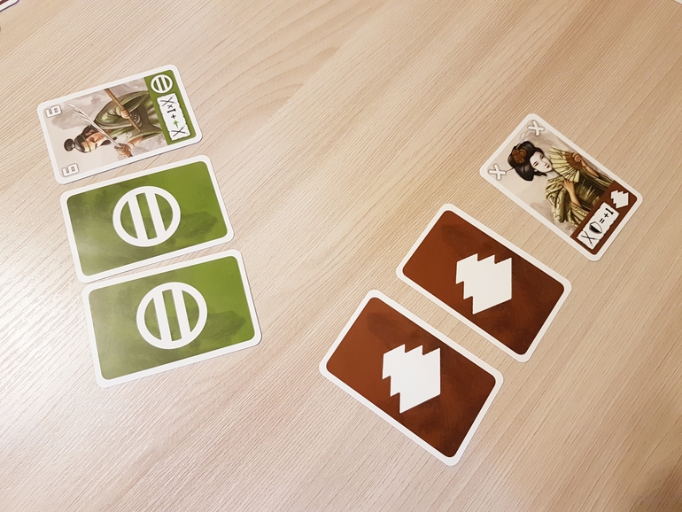 Для меня наиболее просчитываемой является игра вдвоем 😁, потому что достаточно легко запомнить, какие карты у соперника уже вышли (в плену или ушли в сброс), и предположить, что соперник может положить сейчас. К примеру, дочка любит после первого ушедшего крестьянина выкладывать даймё (карту с силой 9). Вероятность 90%, что это будет именно он 😃. Даймё - крупный феодал-полководец, которому нет равных в силе и влиянии. Никто не может напасть на даймё и взять его в плен (только атакующая гейша захватывает его своими чарами).