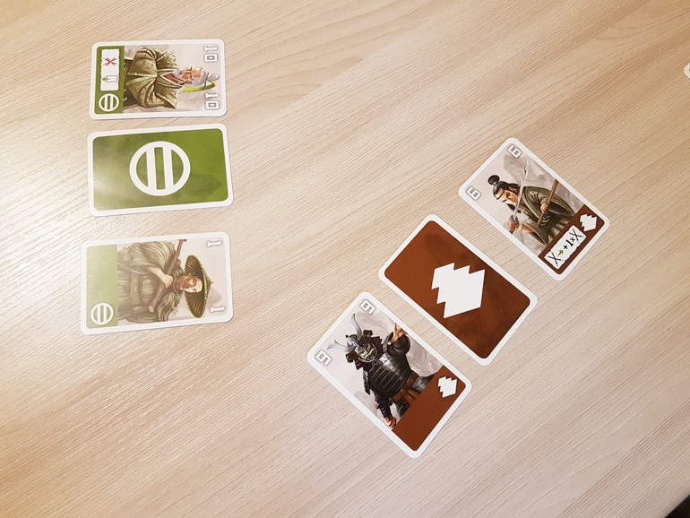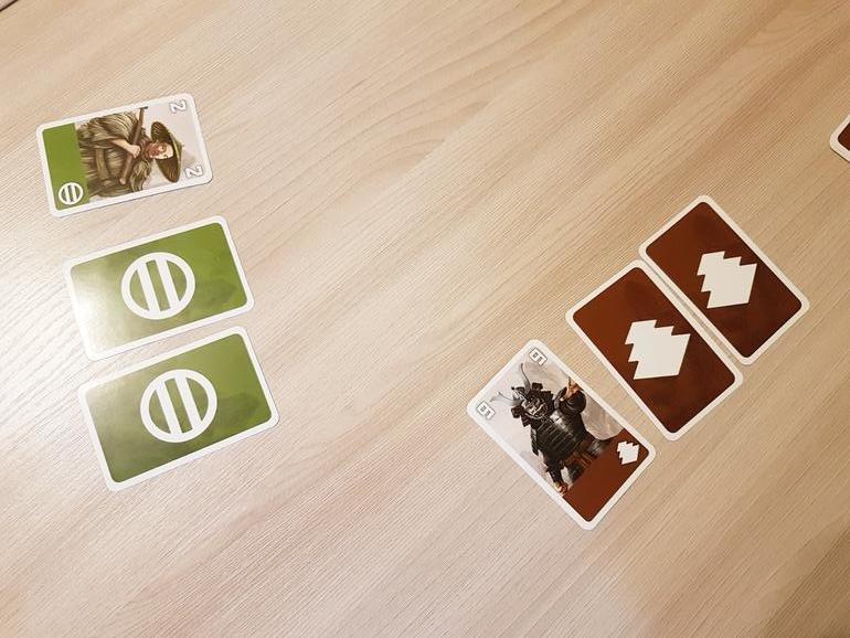 Сражение продолжается, пока у одного из игроков не закончатся карты на руке, в связи с чем он не сможет пополнить свой отряд на столе до трех карт. Победил в сражении тот игрок, у кого сумма силы пленных воинов больше, он получает всевозможные почести императора (и право выбрать, в какую игру играть дальше 😁). В этой партии я победила с большим отрывом (мои пленные - коричневые), дочка отвлекалась и не запоминала, что у меня выходило, соответственно играла больше наугад (хотя и так можно, особенно если все соперники полагаются на удачу).
