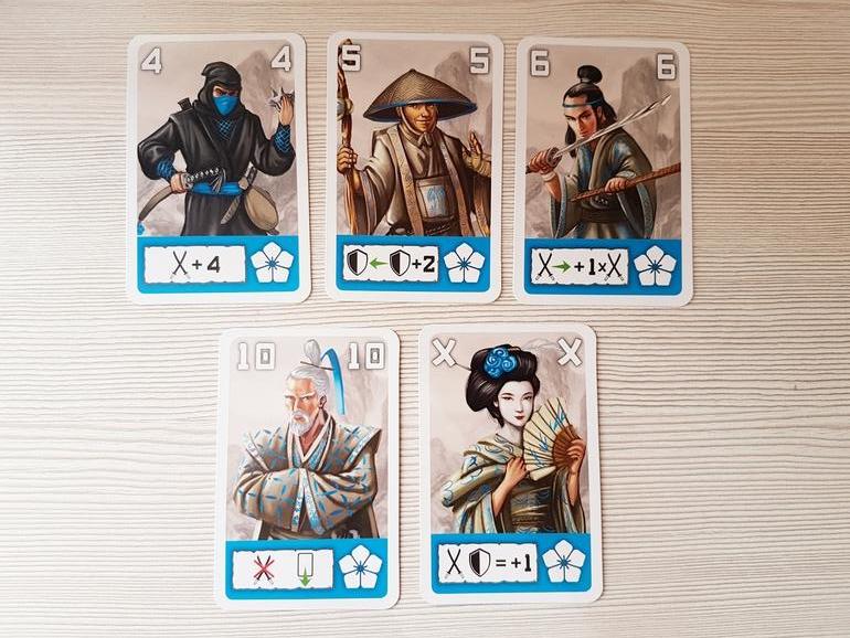 Все они имеют свою силу, которая поможет победить в сражении. Сила обозначена цифрой в верхних углах карты - от 1 до 10. Одиннадцатая карта - это гейша. Она не имеет цифры, обозначающей силу, потому что она не сражается, а одерживает победу своей красотой и обаянием. Поэтому в игре гейша всегда побеждает любого другого персонажа и никогда не попадает в плен.