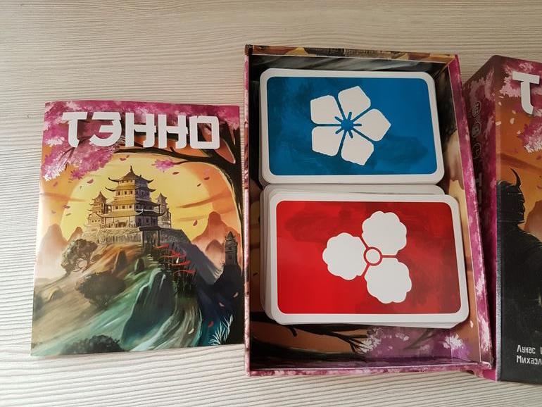 В Тэнно могут играть от 2 до 7(!) человек, соответственно в комплекте 7 наборов карт, отличающихся только рубашкой. И 3 памятки (нужны только во время первой партии).