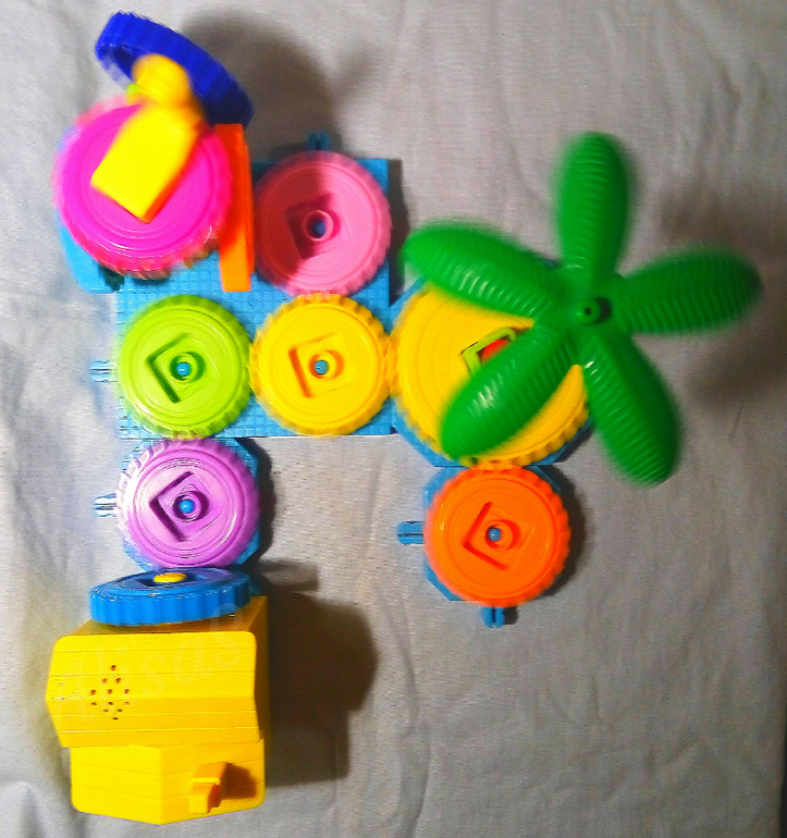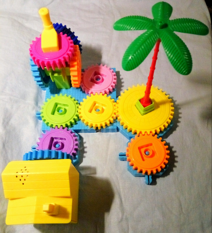 Это все были статические конструкции, т.е собрали на полу/столе и стоит оно все это и вертится, если нажал на кнопку домика или вертишь с помощью ручки, которая в комплекте (к слову, более качественная, чем у конструктора Фанни, но так же неудобно быстро вращать, постоянно вылетает из гнезда на шестеренке). В общем-то, ничего такого в этом конструкторе нет. Все слишком просто - шестренки работают только на пластинах соответствующего размера. Немного усложняется при вертикальных сооружениях, если используются шестеренки разного размера - нужно подобрать высоту с помощью салатовых элементов, пример которого приведен под пальмой.