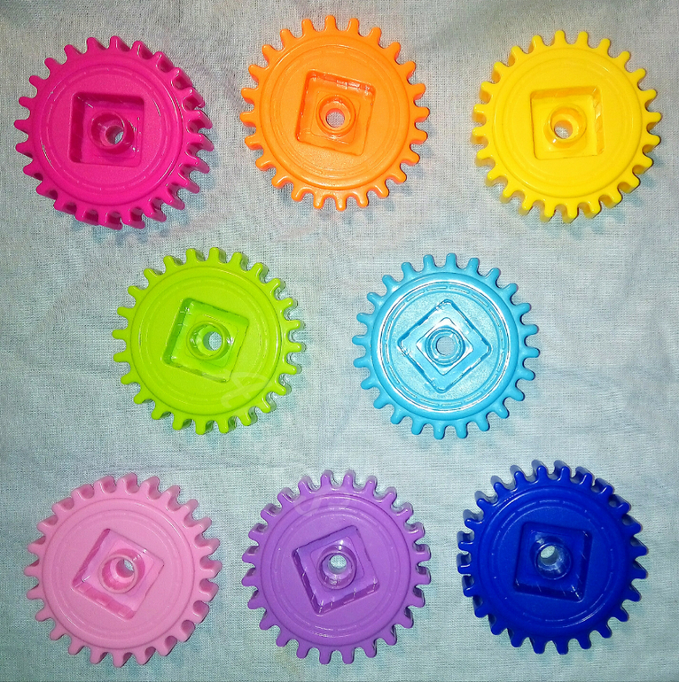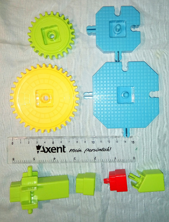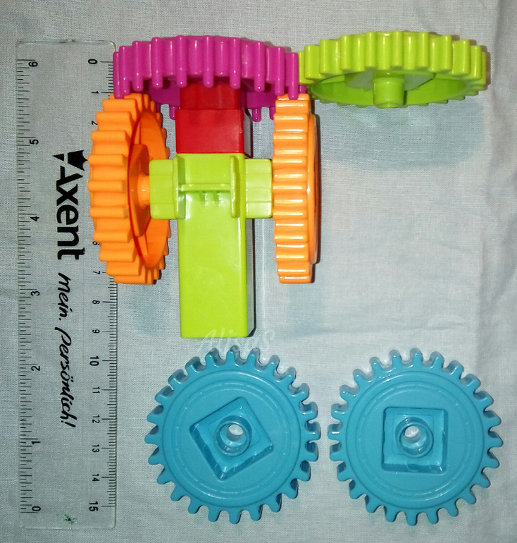 Два вида шестеренок - обычные и с длинными зубами, как говорит сын. Те, которые с длинными зубами используются для передачи вращения на зеленых вертикальных соединительных элементах: