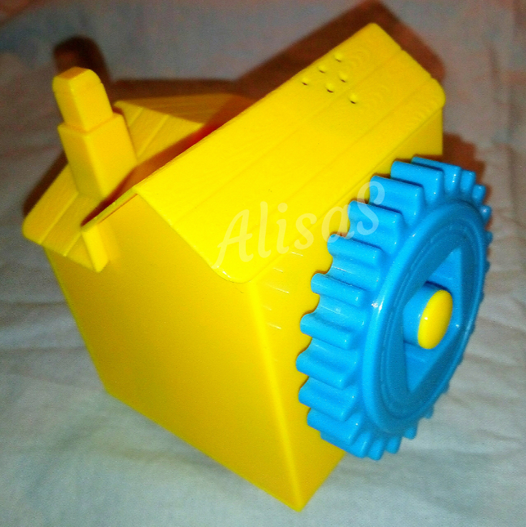 Домик, сидит на одной из пластин, вращает шестеренки и "поет" песню по циклу. Если правильно помню, то все же есть режим без песни, т.е вкл, вкл с песней и выкл.