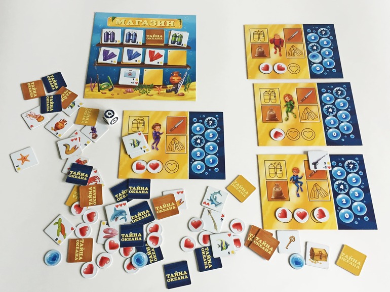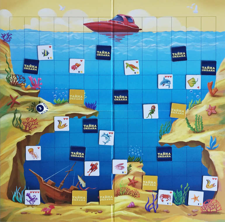 Игра от того же автора, что придумал "Зомби в доме" и "Пришелец". По механике похожа на "Зомби в доме" перемещением по клеткам и открытием заранее разложенных карточек, но все это происходит под водой и здесь есть свои фишки.