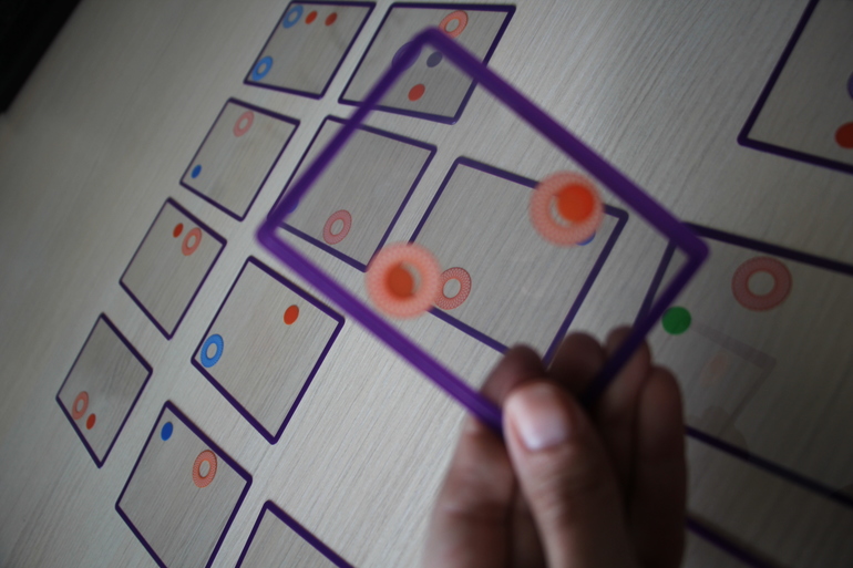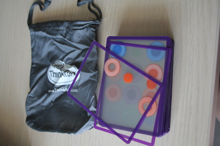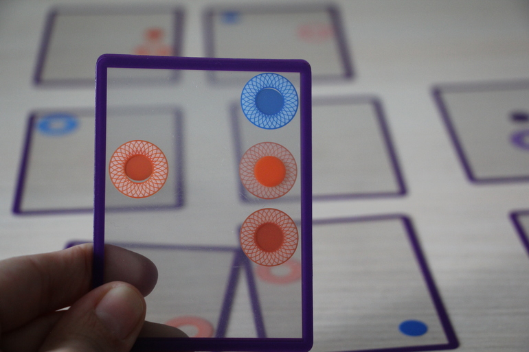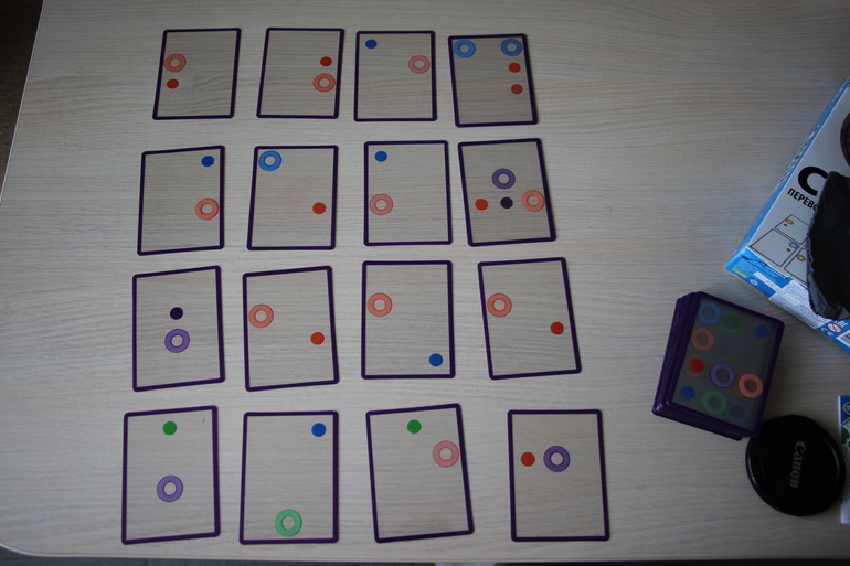 Точки и кольца расположены в 12 разных местах (три столбца и 4 строки). Карты можно переворачивать чтобы совместить точку и кольцо. Лишних точек и колец не должно оставаться.