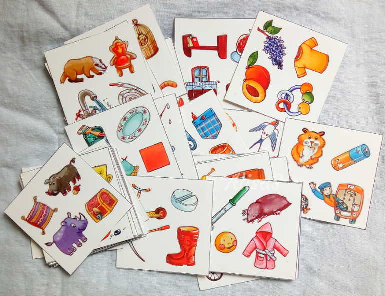 На столе выкладываются несколько карточек и все начинают искать среди изображений те, чьи названия рифмуются. Тот, кто первым озвучивает рифму, забирает карточки себе.