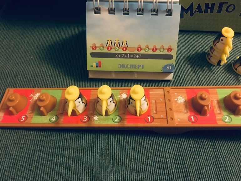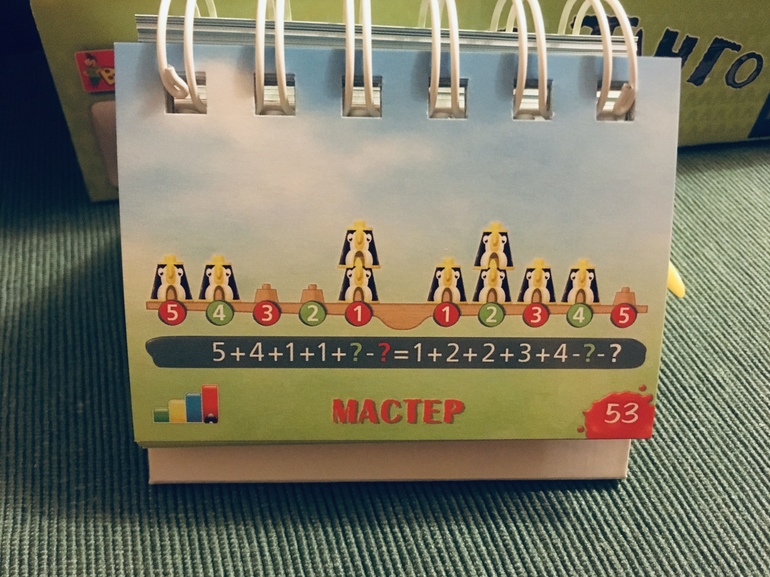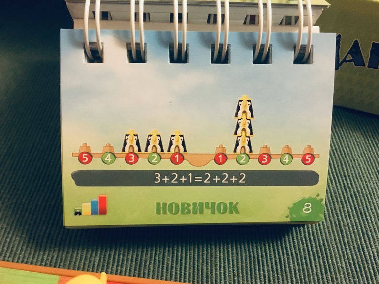 С сыном мы буквально пару заданий сделали из уровня новичок на расстановку. А как только он понял принцип, я сделала следующим образом. Например, в задании 8 , чуть выше фотография, я диктую сыну( блокнот с заданиями у меня в руках, ребёнок его не видит) : три плюс два плюс один. Сын уже понял, что это цифры, на которые нужно посадить туканов- сделал. Затем говорю равно и диктую условия следующей шкалы: два плюс два.