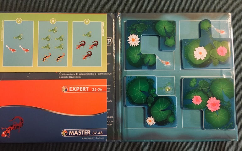 Почему-то логические игры с подобной механикой пряток моим детям наименее интересны. Эта головоломка появилась у нас, когда сыну было 6 лет, а дочке 9. Но ни разу дети не продвинулись дальше второго десятка заданий. Дома вообще эту головоломку не берут в руки. Лишь в транспорте, если я положу в рюкзаки , могут порешать Подводный мир и Деловые жуки. Я, кстати, тоже почему-то с неохотой приступаю к решению этих игр, да практически и не решала их до сегодняшнего дня.