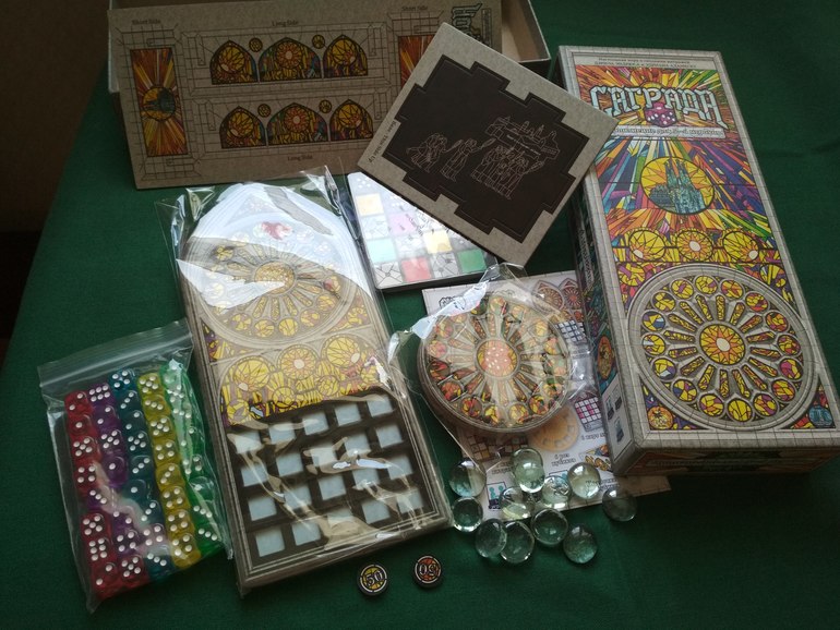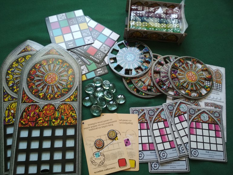 В коробке два дополнительных поля в виде витражного окна. Дополнительные кубики, жетоны подсчёта очков и стеклянные шарики для "покупки" инструментов. Два дополнительных инструмента и карточки новых заданий.