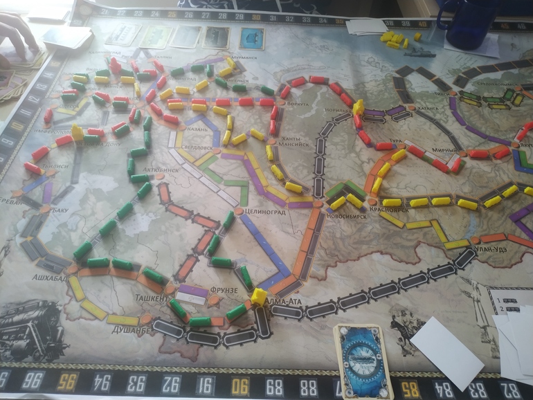 На троих довольно свободно. Сыграли пять партий, в каждой только раз кто-то кому-то перешел дорогу. Но не критично, обрулить и достроить маршрут возможность осталась. И очень (очень!) приятно читать названия городов по-русски. И от этого карта запоминается и легко в голове держать много недостроенный маршрутов. В Северных странах я все города читаю про себя и уверена что неверно.