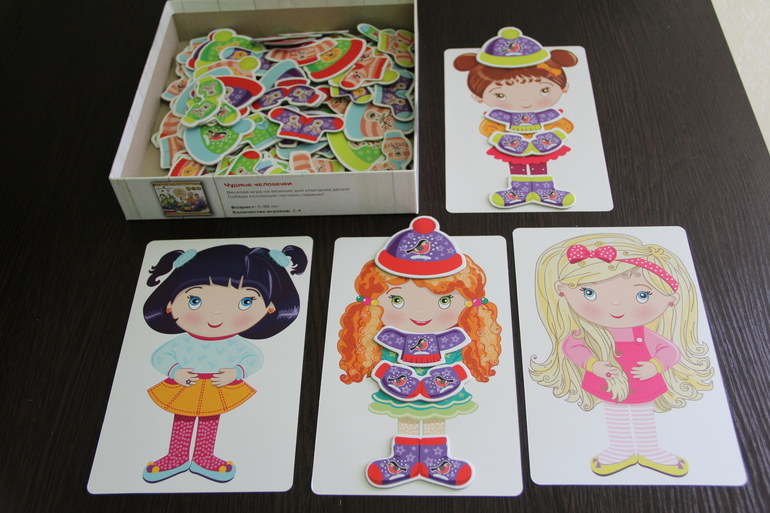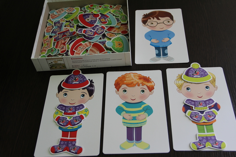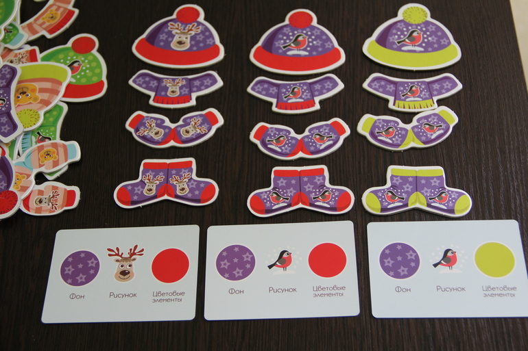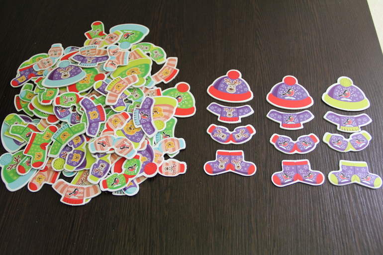 Как всегда качество на высоте. В наборе 28 карточек с заданиями, по 28 варежек, носочков, шапочек и шарфиков, а так же 4 двусторонних планшета( или карточек) с персонажами. Персонажи в игре со всеми вариантами цвета волос, тема с мальчиками и девочками сыну особенно нравится , она используется и в игре Раз овечка, два овечка и мама всегда с девочками играет, а сын с мальчиками.