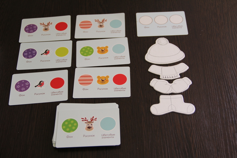 В карточках используется 3 фона: горохи, полоски и звездочки, 3 вида милых животных: олень, мишка и снегирь и 3 вида цветовых элементов: красный, голубой и салатовый, всего этого с головой хватает, чтобы на втором ходу уже начать путаться что же в итоге надо найти.