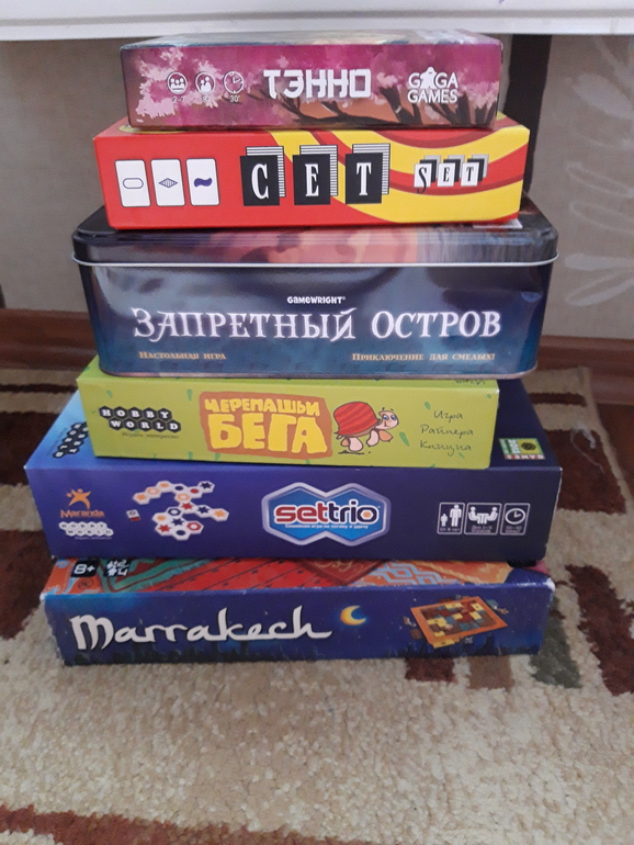 4. Сеттрио. А тут уже моя победа, не везло сыну с фишками. Хорошая быстрая игра, не маст-хэв, но приятная. И, наверное, единственная которой не страшен наш младший сын-грызун: фишки большие, не проглотит и не откусит.