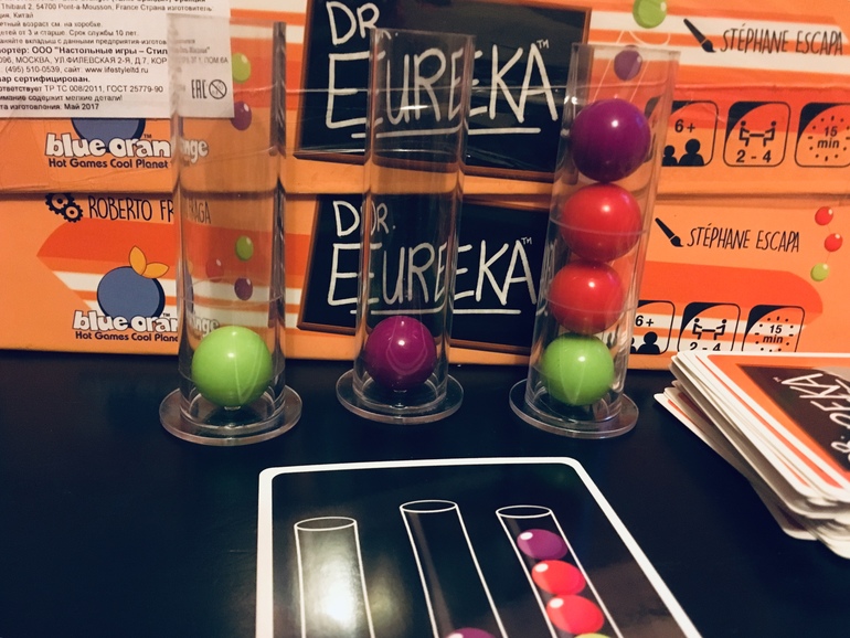 Доктор Эврика. Каждому игроку выдаётся три колбы. В каждой колбе по два шарика одного цвета. Первый игрок или родитель открывает карточку Все игроки , как можно быстрее, стараются расположить шарики в своих колбах так, как показано на карточке. Шарики нельзя трогать руками, только перекатывать из колбы в колбу. Если шарик упал, то игрок в этом раунде из игры выбывает. Результат: Игрок , первым собравший пять карточек, побеждает. Но можно играть просто на количество побед, пока не закончатся карточки . Их в коробке 55 штук.
