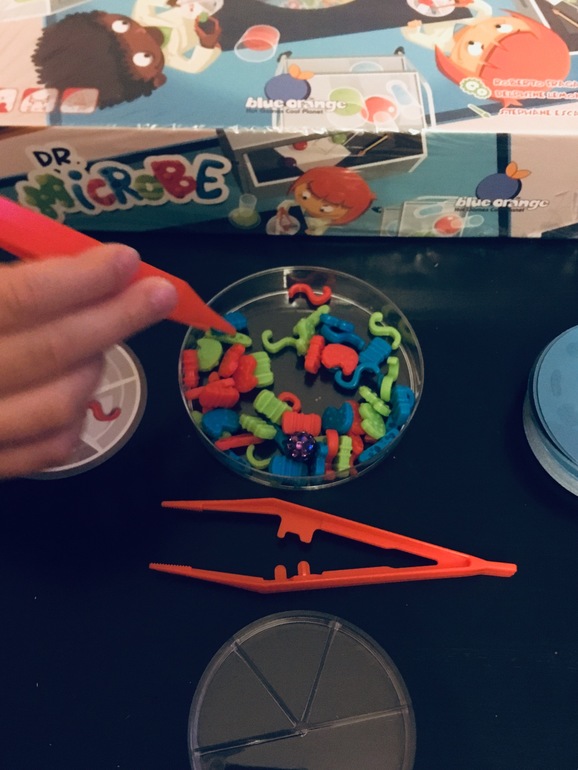 Доктор Микроб. В коробке общая чаша с четырьмя видами микробов трёх цветов. Каждому игроку выдаётся маленькая чаша с четырьмя секциями и пинцет Открывается карточка. Все игроки начинаю как можно быстрее выкладывать микробы в свои чаши. Сначала те, которые указаны на карточке, а потом добавляют в оставшиеся ячейки по особым правилам. Три маленькие секции в чашах игроков предназначены для микробов, а одна большая для особого микроба- антидота. Антидот должен отличаться формой и цветом от остальных трёх микробов в чаше. А 3 микроба в маленьких отделениях, соответсвенно, должны отличаться формой и цветом от антидота. Два микроба в маленьких отдалениях могут совпадать по цвету, но должны отличаться по форме . Вообще все микробы в чаше игрока должны отличаться по форме. Смотрим на карточку, нам нужно самим определить антидот и поместить его в чашу. Он должен отличаться по цвету и форме от остальных трёх. Следовательно, он будет синего цвета и тонкой вытянутой формы. Это самые легкие карточки, в которых нужно добавить всего один микроб. Находим карточку посложнее . Здесь уже нужно было добавить два элемента. А есть такие, где изначально известен только один компонент. Все эти манипуляции нужно успеть совершить раньше других, ловко орудуя пинцетом. В коробочке на первой фотографии есть ещё фиолетовый шарик- это антивирус. Его рекомендуют использовать в усложнённых правилах. С помощью этого вируса можно мешать другим игрокам, подбрасывая его к ним в чашу. Также можно подбрасывать другим игроки неверные микробы. Об этом подробно написано в правилах. Карточек в игре тоже 55 штук.