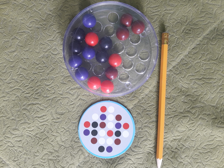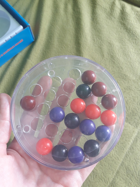 Скажу сразу, мне очень понравилась. Шарики не пустотелые, даже не знаю как сказать, где-то средней тяжести. Коробочки запечатаны, т.е. шары не вылетают. Дала попробовать сыну, ему очень тяжело, он пару раз попробовал и вернул обратно мне(не любит ребенок трудностей). Детские пальцы в ячейки полностью заходят, у меня чуть-чуть. Помимо того, что надо эту колбу держать в равновесии, а то шары убегут, нужно правильно ход продумать, а то ненужные шарики могут заблокировать пути и придется все заново перегонять с места на место(это уже из личного опыта). Действия моего сына, сначала всю пятерню засунул, неудобно, потом понял, но держать равновесие не может -шары убегают с нужных мест(начал сердиться), в итоге вроде начал расставлять, тут путь заблокирован, пока переставлял потерял равновесие, часть шаров разбежалась… Будем теперь тренировать пальчики, прежде чем играть на скорость. Я в восторге от этой игры, рекомендую.