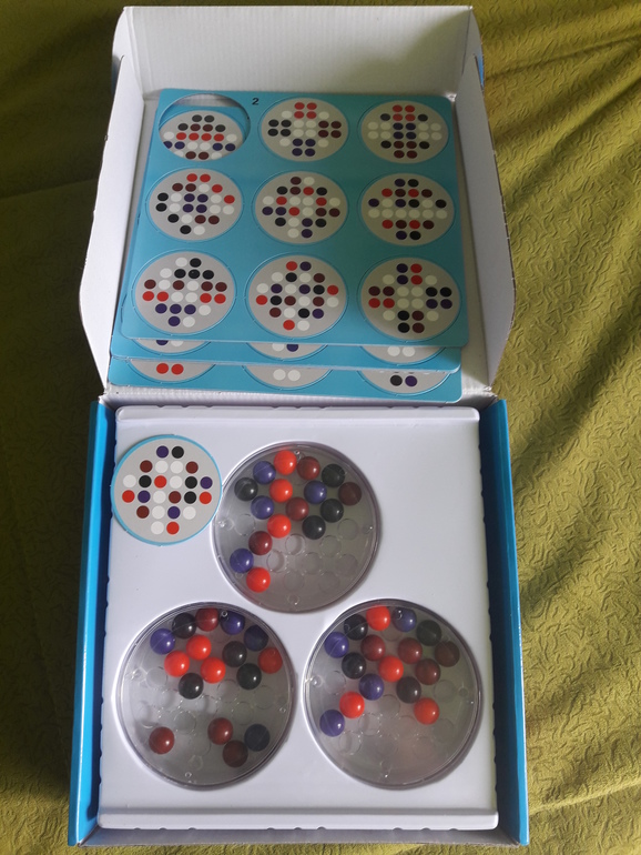 В наборе идет 3 круглые коробочки с шариками и 36 карточек с заданиями.