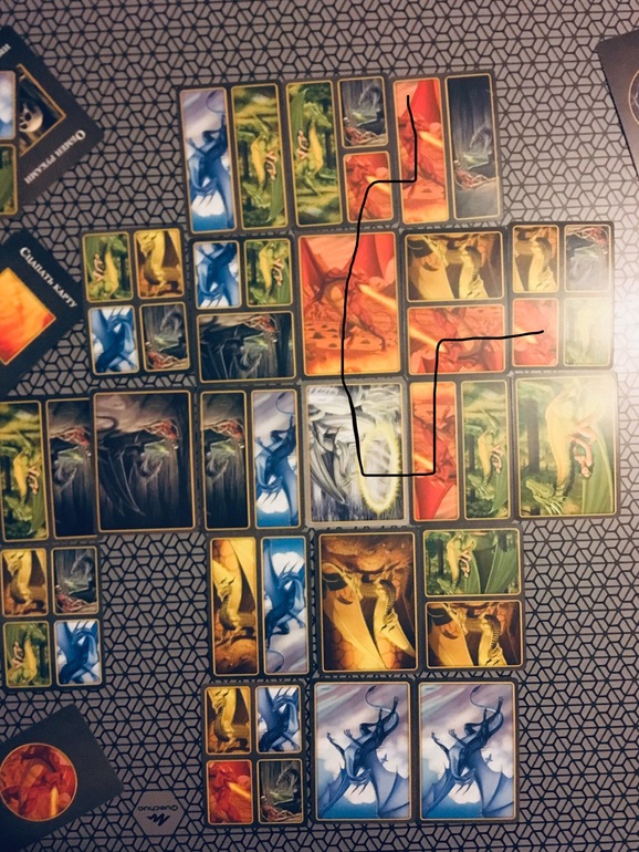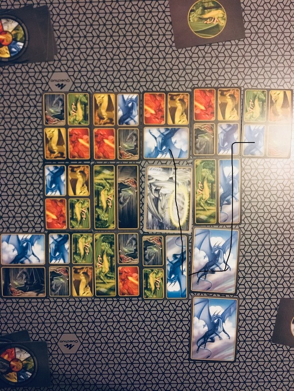 Это две мои выигрышные партии, в которых цепочкой соединены драконы того цвета, который достался мне тайно в начале игры. Зеркальный дракон в середине стола в обеих случаях был нужного мне цвета и я задействовала его в моих цепочках. Хотя обычно карт на столе намного больше в конце партии. Эта игра появилась у нас прошлым летом и играли мы в неё , я даже не скажу , сколько партий в день. Играть хотелось постоянно. Сейчас достаём реже только потому, что и другие игры есть. Если бы коробочек было меньше- мы бы с этой игрой не расставались.