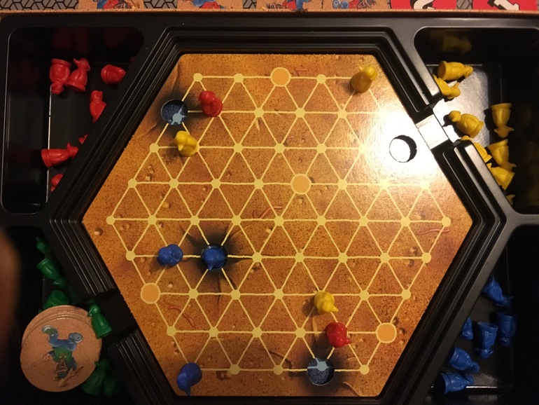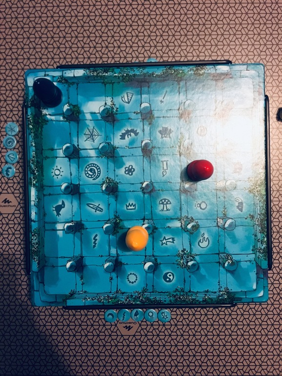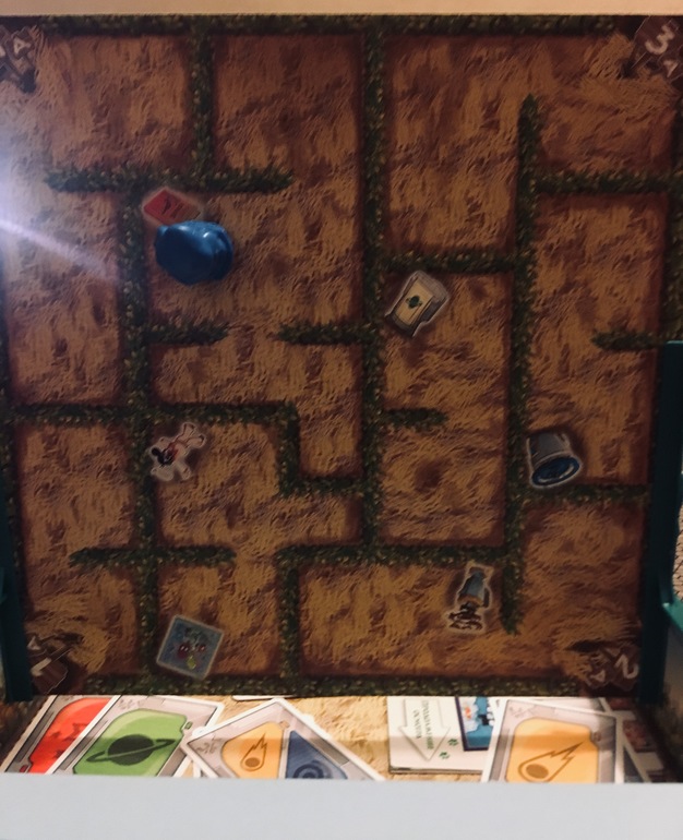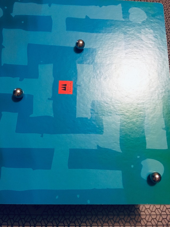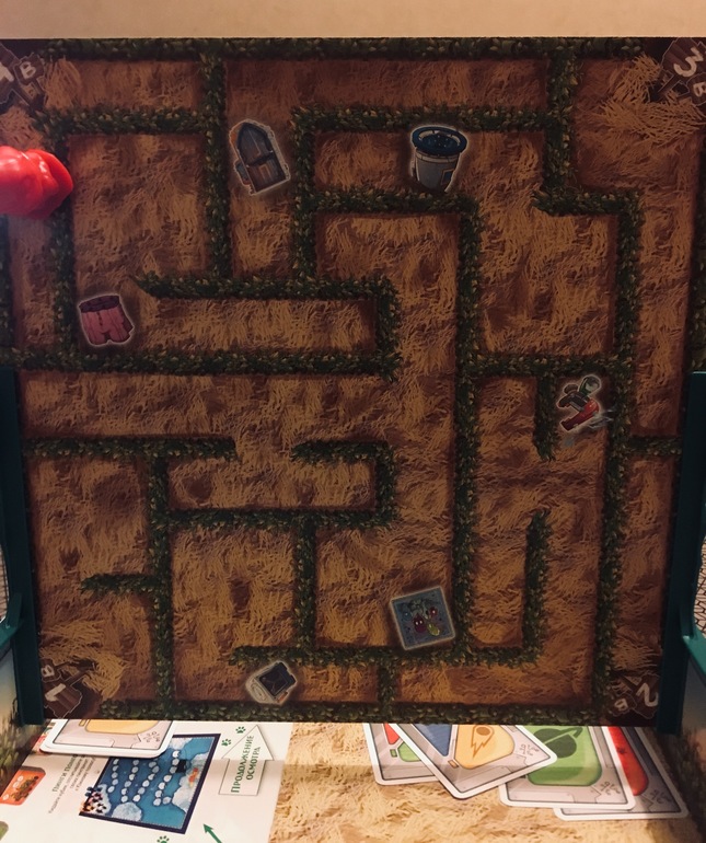 Из мешочка достаётся предмет, кладётся на своё место на картонном поле, и участники должны первее других добраться до этой находки. И вот тут начинается самое сложное. Вы пытаетесь пройти невидимый лабиринт, постепенно запоминая, где находятся перегородки и обходные пути. Если же Ваша фигурка проходит невидимую преграду, то шарик снизу натыкается на препятствие, падает и фигурка игрока возвращается на стартовую позицию.