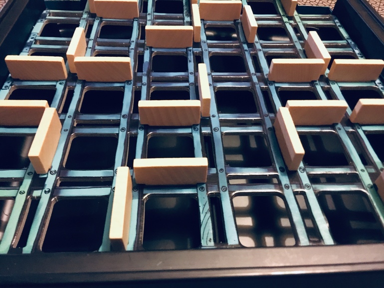 Т. е. вверху игровой площадки большие деревянные фишки, а снизу к фишкам примагничиваются шарики.