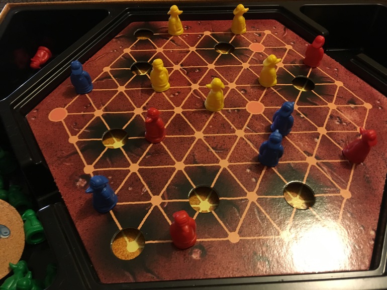 А необычность её в том, что огромное игровое поле устанавливается вертикально, а к нему прикрепляются два инопланетянина . Они цепляются друг к другу магнитами и разделяет их вот это игровое поле.