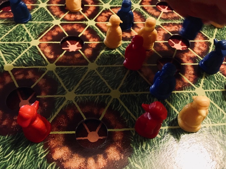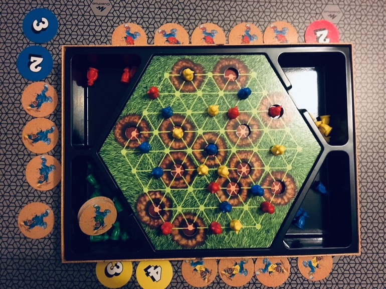 Игроки по очереди выставляют кротов на верхний ярус. Затем по очереди открывают один из своих кружков. Какое число оказывается на обратной стороне-на столько шагов и ходим. Как только все лунки на поле заселяются кротами, верхний ярус снимается. И всё кроты, которые на нем остались, выбывают из игры.