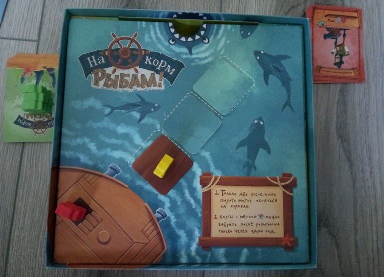 Итак, «На корм рыбам!» Просто не могла не открыть её после стольких упоминаний в Сообществе. Поэтому, когда дома наконец появился третий игрок в лице мужа, прозвучала команда - «свистать всех наверх!». Сыграли одну партию по детскому варианту, когда все карты лежат закрытыми перед игроками и переворачиваются друг за другом без возможности выбора действия. На пару с сыном утопили папину команду. Впечатление об игре по пробной партии не сложилось. Муж пожал плечами; сын сказал, что не совсем понял смысл происходящего. Я всё поняла, но детский вариант «слепая удача» показался безынтересным.