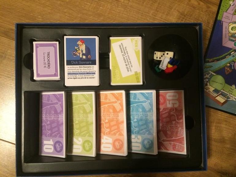 Игровое поле: план Парижа и окрестностей, на котором помимо обычных клеток с названиями улиц есть 9 (не могу подобрать слово) пиктограмм: булочная,заправка,магазин,ночной клуб,достопримечательность,аптека,кафе,парк,случай.