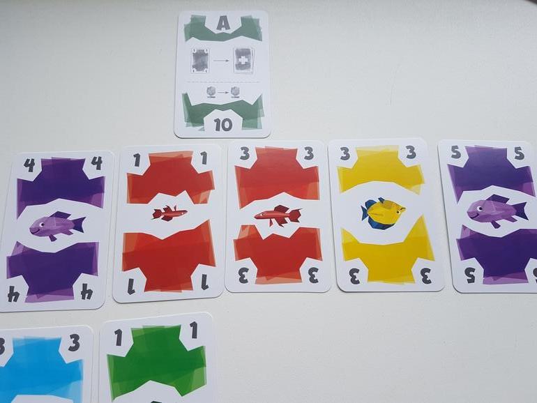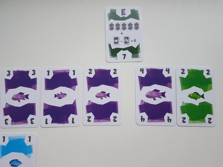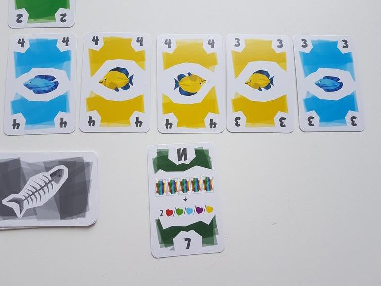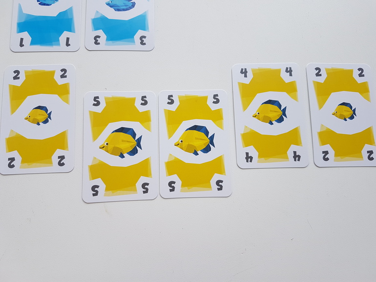 Зелёную кладу рядом с начальной зелёной (совпали по цвету), затем жёлтую (на жёлтый цвет не заканчивается ни один из рядов), вторую жёлтую (совпадает по цвету с предыдущей) и красную (на красную не заканчивается ни один ряд). Как только в ряду появляется пятая карта, игрок, который ее выложил, должен весь ряд забрать. Это его улов. Но в ведерко с победными очками пойдет только по одной карте каждого цвета. То есть из примера выше одна зеленая и одна желтая карты это штрафные очки (конечно, выбираем для штрафов те значения, которые меньше - в данном случае это зеленая 1 и желтая 4). Не очень выгодный ход (в плюсы 9 очков, в минусы 5), поэтому я схожу по-другому, положу только одну желтую карту.