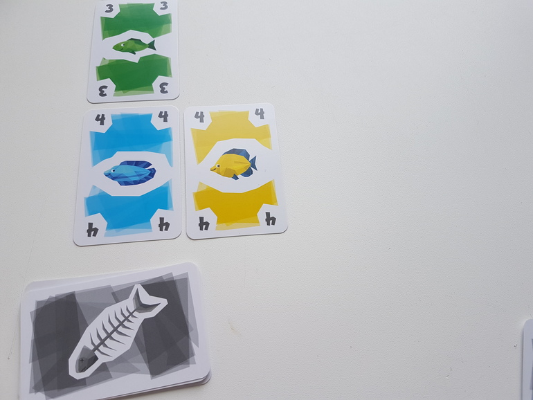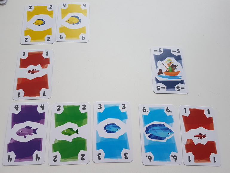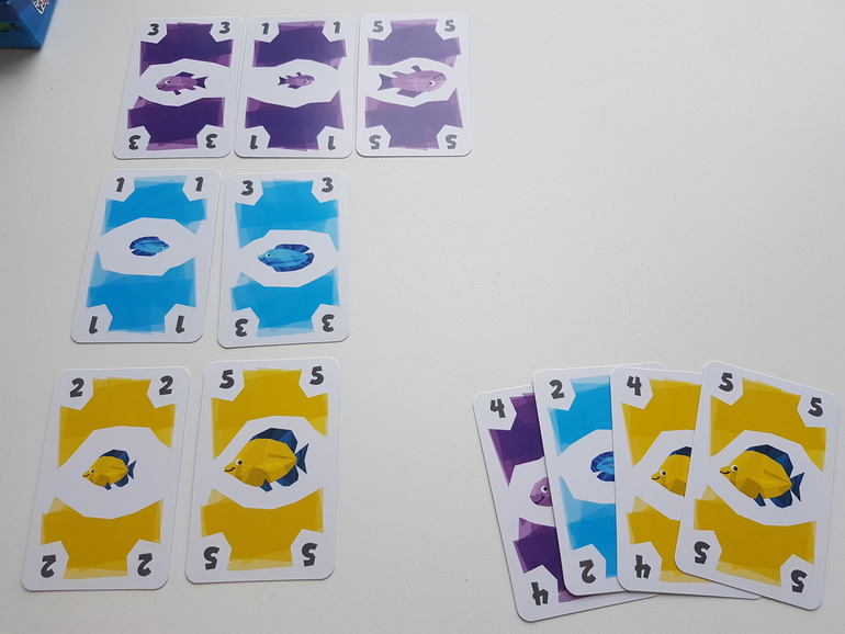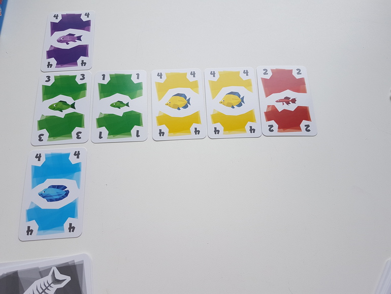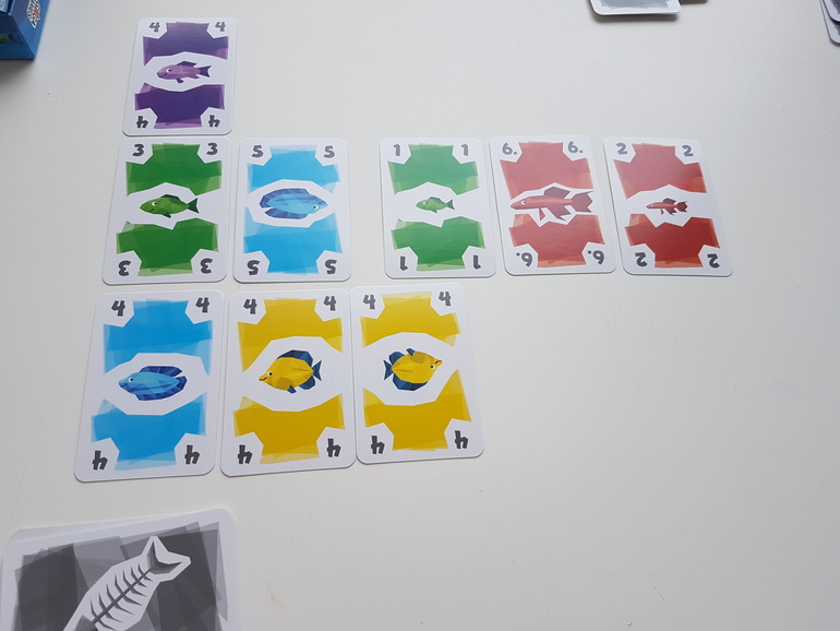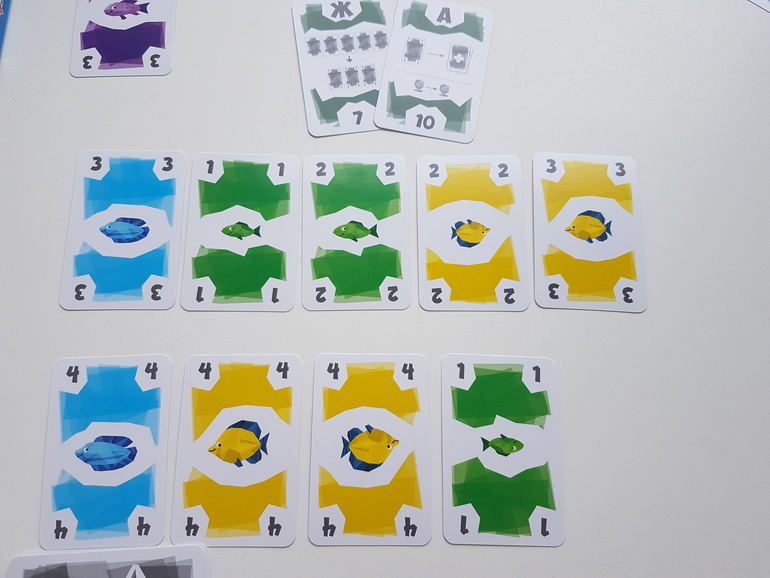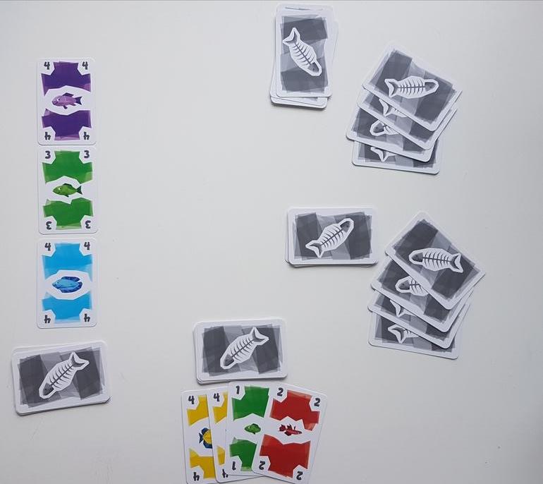 Первые партии рекомендуют играть без карт рыболовных лицензий. Каждый игрок получает по 12 карт рыб, 4 из них берёт сразу в руку, остальные лежат рубашкой вверх перед игроком. На стол выкладываем 3 карты - это начало рядов, которые мы будем формировать и собирать. И несколько карт для новых рядов.
