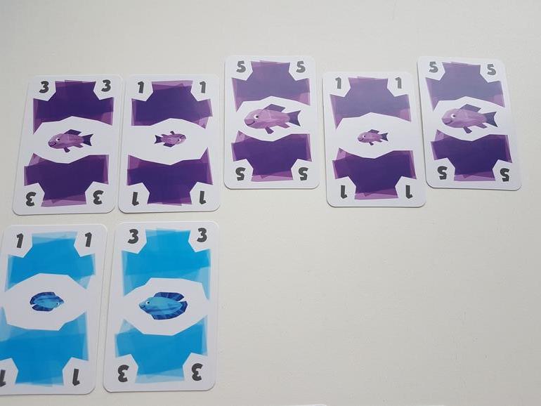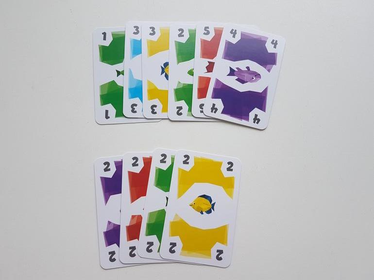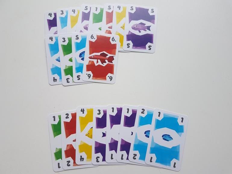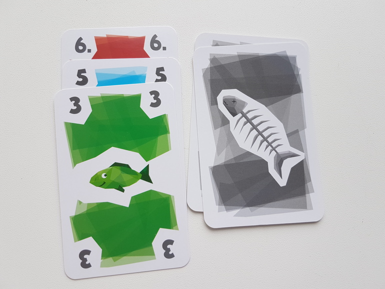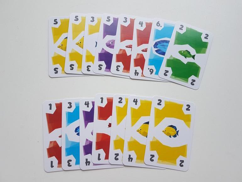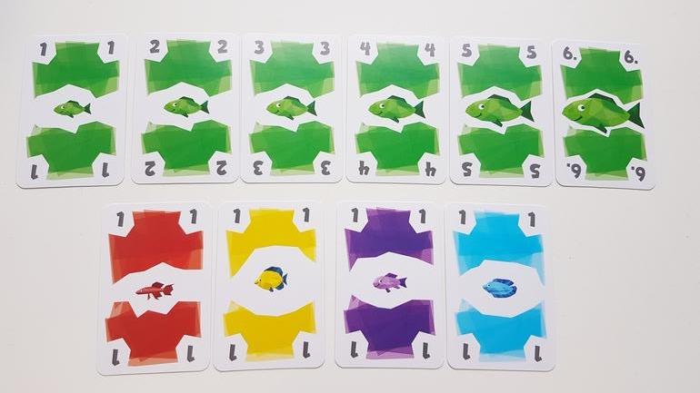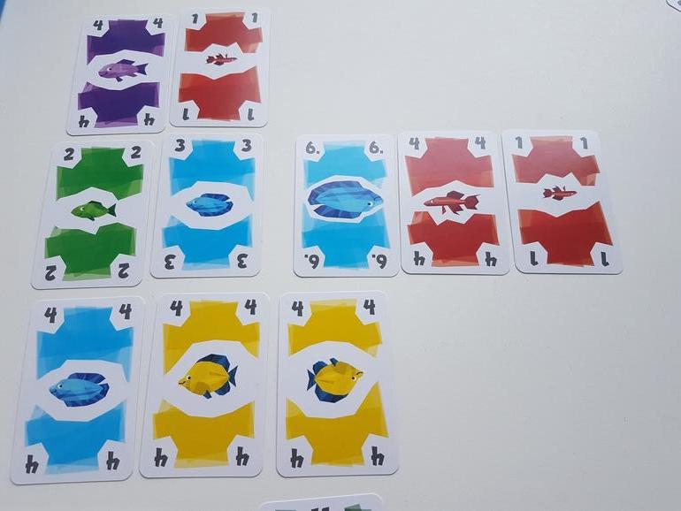 Первые партии рекомендуют играть без карт рыболовных лицензий. Каждый игрок получает по 12 карт рыб, 4 из них берёт сразу в руку, остальные лежат рубашкой вверх перед игроком. На стол выкладываем 3 карты - это начало рядов, которые мы будем формировать и собирать. И несколько карт для новых рядов.