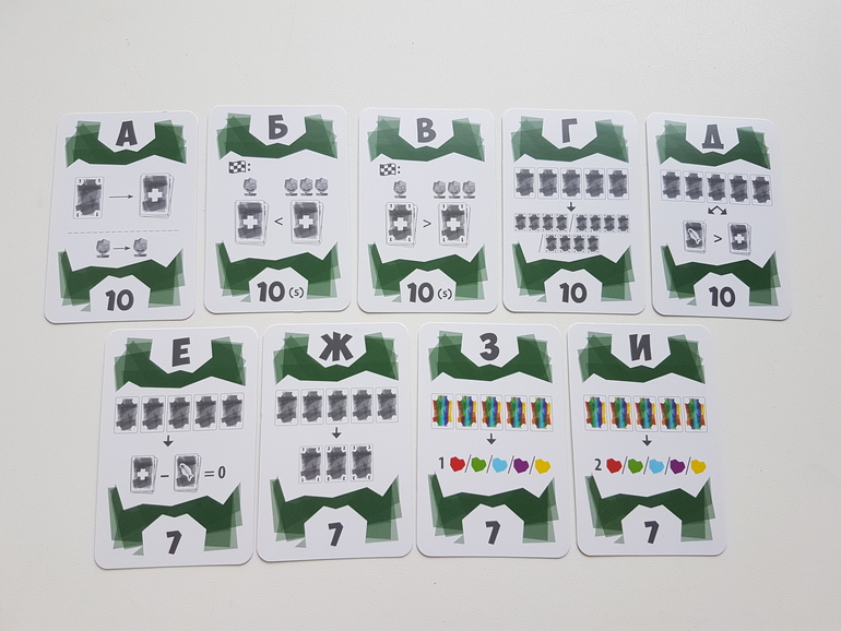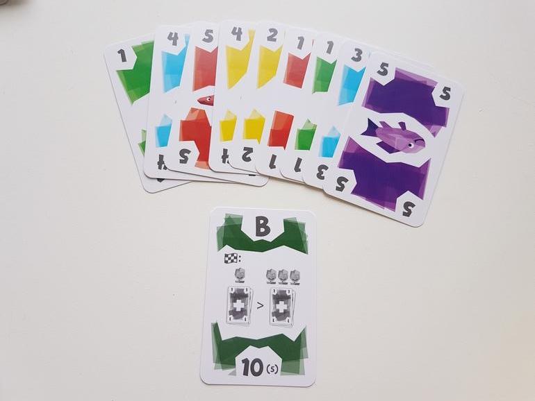 Это гораздо более выгодный улов - всего 3 очка штрафных (зеленая 1 и красная 2) и 14 победных. Размещаю полученные карты возле себя, штрафы скелетиком вверх.