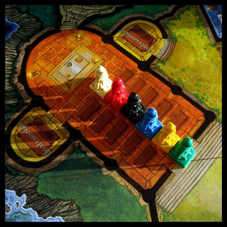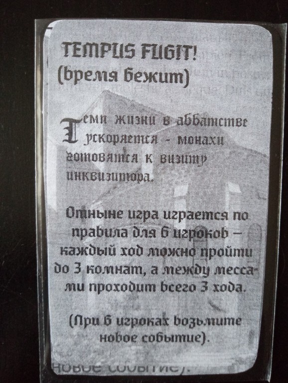 Кроме того, оказавшись в одной комнате с другим монахом можно задать ему любой вопрос (сколько у тебя бородатых монахов в руке? сколько ты уже вычеркнул тамплиеров? если ли у тебя на руках отец Даниил? и т.п.), он может уклониться от ответа, но если всё же ответит (правдиво конечно, игра не для жуликов), то затем тоже имеет право задать вам вопрос, на который вы будете обязаны дать ответ.