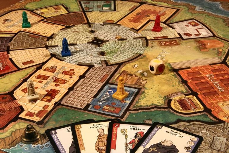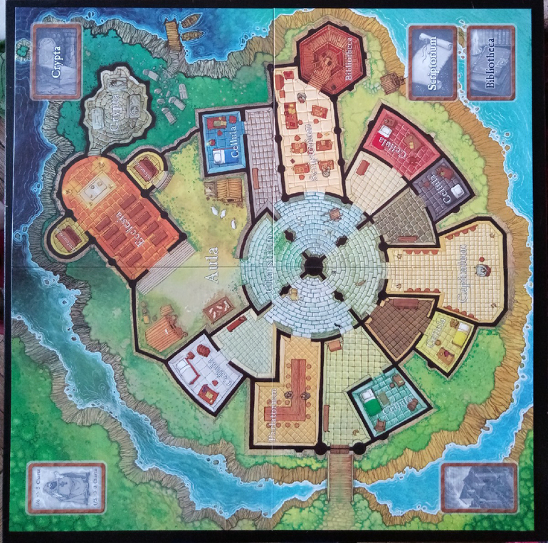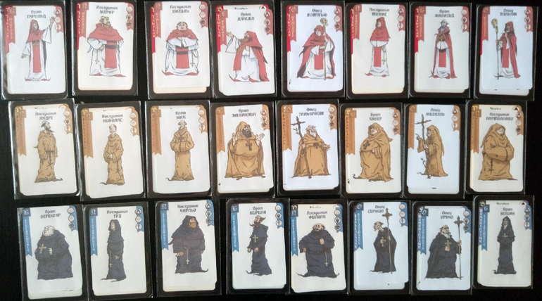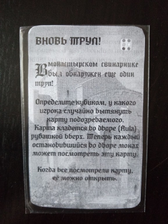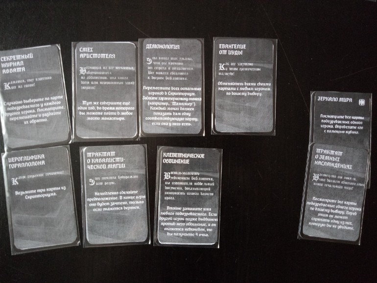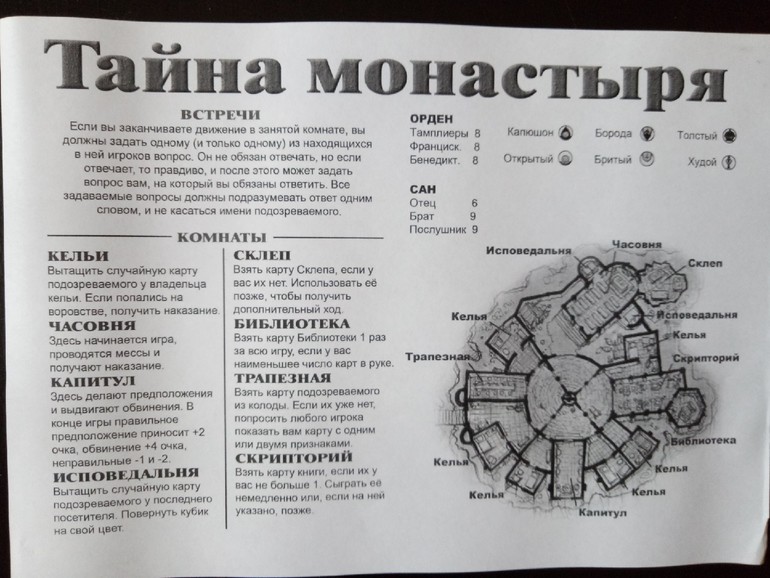 Итак, игра похожа на продвинутую версию Cluedo. Аббатство, куда нас принесла нелёгкая, служит жилищем для 24 живых монахов и одного убитого брата Адельмо. Наша задача будет найти убийцу (колода из 24 монахов перемешивается и одна карта не глядя прячется под игровое поле). Всем игрокам поровну раздаются карты подозреваемых (тех самых монахов), несколько из них кладутся на определённое место на поле и игра начинается.
