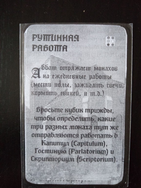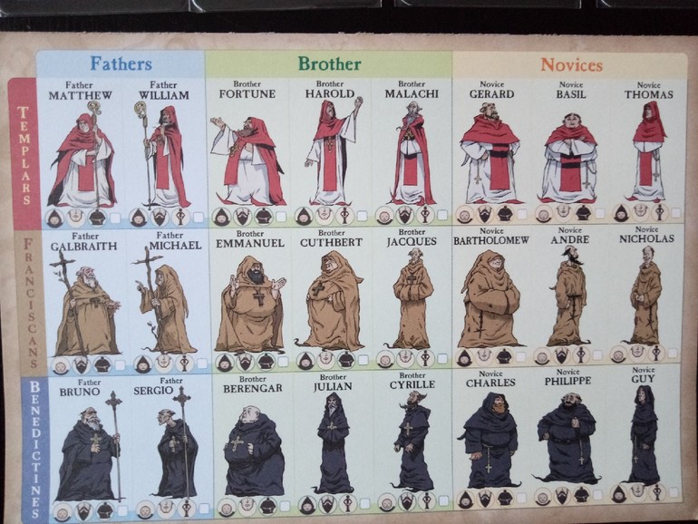 Во время партии монахи должны бесцельно слоняться ходить по монастырю, рыться в библиотеке, заглядывать в скрипторий, проникать в чужие кельи, наведываться в трапезную, приставать к другим монахам с неуместными вопросами и регулярно (каждые 4 хода) являться в часовню на мессу (и передать соседу одну или несколько своих карт, кстати, насчёт количества передаваемых карт есть большие разночтения в оригинале и ПНП).