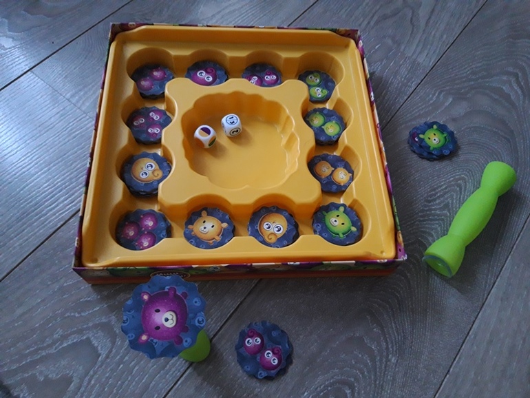 Ирина соблазнила меня своим постом на покупку этой игры. Долго я сомневалась, а когда коробочка оказалась у меня в руках, отказаться я не смогла. Качество компонентов очень радует! Фишки из плотного картона, пищалки приятно ложатся в руку и, конечно, нравятся детям. Малышка еще не оценила игру, а сыну понравилось. Удалось даже поиграть с нашей гостьей 6 лет (в настольные игры дома не играет вообще). Дети с большим азартом охотились на разноцветных чудиков. Обычно используем 2 кубика. Пробовали 3, но там часто приходится перебрасывать, так как нужные сочетания не попадались. С дочкой бросаем один кубик. Не зря я её купила, хочу попробовать и другие игры от Эврикуса, но пока рано. Хотя на Словечки посматриваю и жду заманчивой цены.