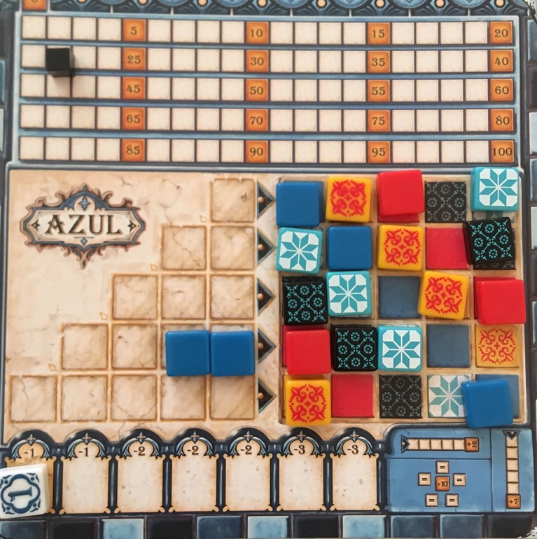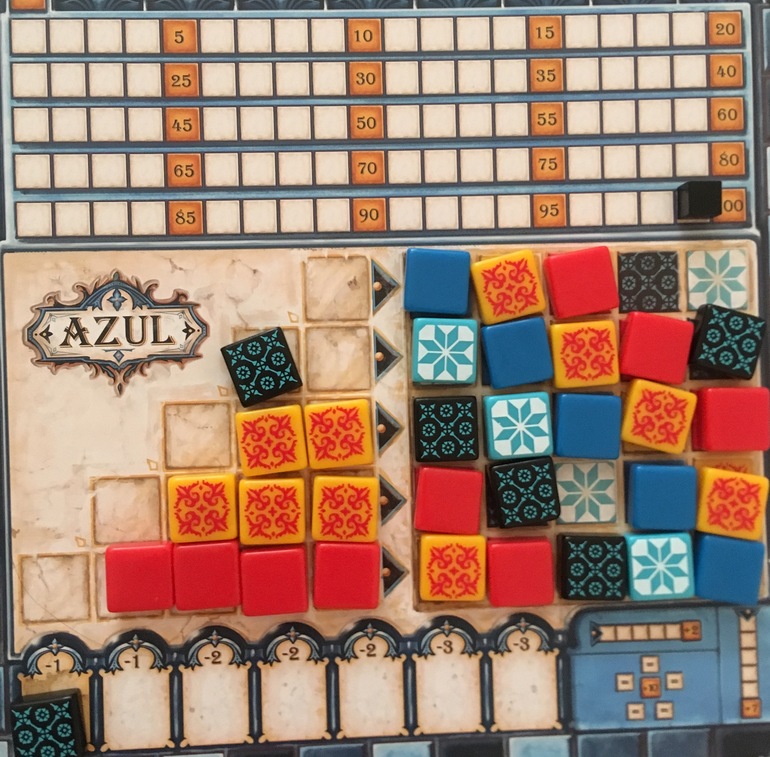 В азуле, кстати кубиков нет вообще. Только плиточки. У нас игр много, но не во все муж играл. Из тех, что ему действительно приглянулись для совместного со мной времяпрепровождения, могу выделить: Лоскутное королевство, Индиго, Азул, квёркл, руммикуб.