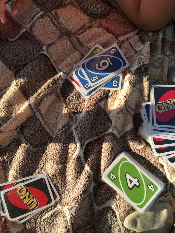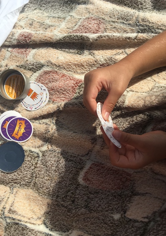 Игр я взяла с собой просто до неприличия мало. Но зато заиграли мы их все до последней карточки. С компанией нам, вне всяких сомнений , повезло несказанно. Детей было много разного возраста. Играли все! Но основными компаньонами моих детей стали их ровесники ,брат и сестра . Играли утром, в обед и вечерами. Каждую свободную минутку ребята бежали к нам. Самыми-самыми играемыми и полюбившимися стали Спящие королевы - эта игра уж который отпуск становится хитом у всех ребят в округе. В прошлом году моя дочка и ещё одна девочка придумали играть в Королев парами, так как желающих было больше, чем обозначенное в правилах количество игроков. И почему-то именно такой вариант игры ребятам даже больше понравился, чем тот, в котором каждый сам за себя. Вот и в этот раз, когда мои дети поведали о таком варианте, все захотели попробовать и уже до конца отпуска играли почти всегда исключительно таким способом. Кот в мешке - покорил юных игроков, каждый день несметное количество партий. 10 свинок, к моему удивлению, проникли в тройку лидеров этого сезона, без них не обходился ни один вечер в детской компании. С каким упоением одиннадцатилетние дети наравне с первоклашкам считали свинок! Головоноги- самая весёлая игра, без них также не обходится ни один наш выезд. Хохот всегда стоит такой сильный, что просто притягивает к игровому столу, креслу, батуту, веранде , в общем в любое место, где играют дети, всех мимо проходящих отдыхающих. Чуть меньше , но с не меньшим удовольствием, играли в Дуббль животные. На пляж носили неизменный набор этого года: сплэш, уно, цветные дорожки и 5 корон.