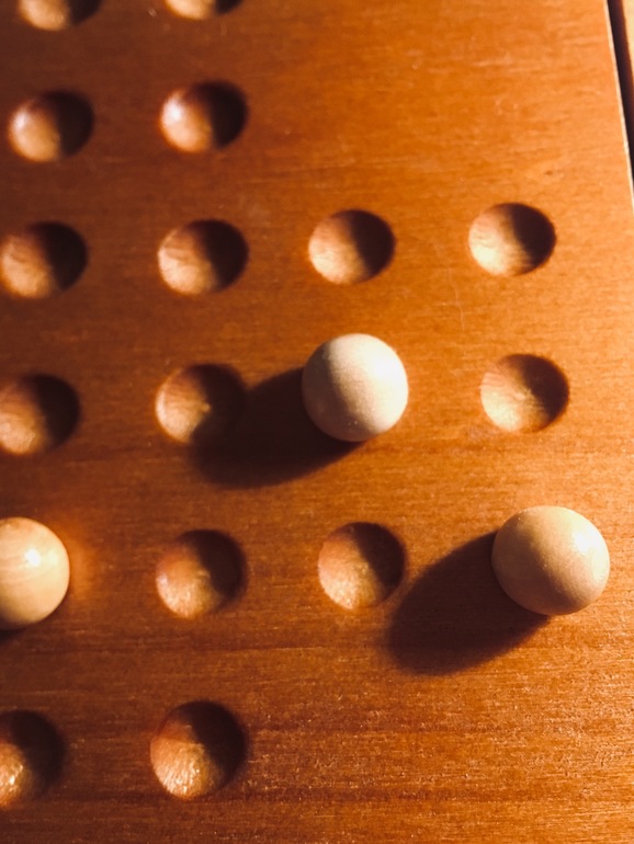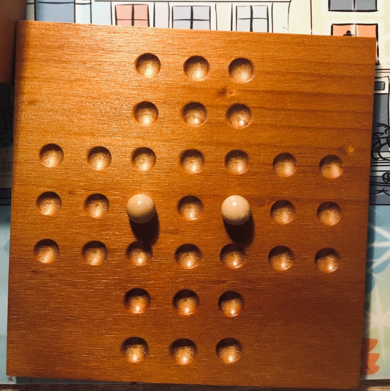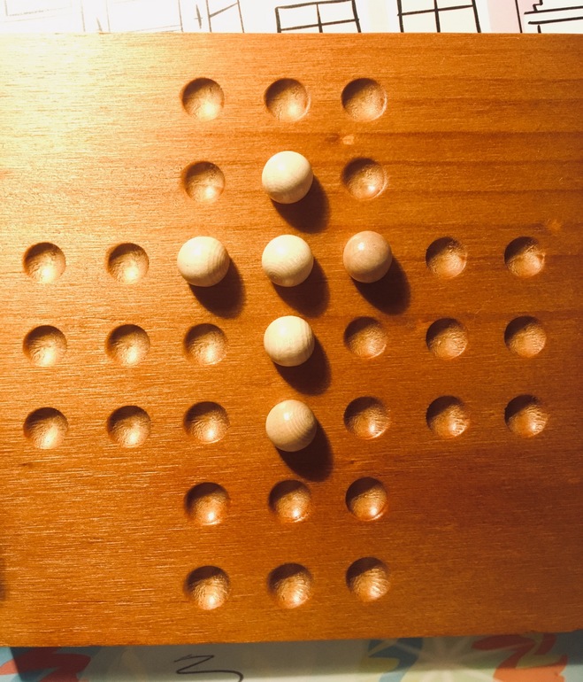 Тем , кому нравится головоломка лягушки-непоседы, я очень-очень-очень советую присмотреться. Игра произвела на меня невероятное впечатление. Я третий день в восторге. Не можем с детьми оторваться, решаем по очереди, подгоняя друг друга. В этой игре, как и в лягушках, нужно перепрыгивать шариком через другие шарики, убирая их с поля. Цель: на поле должен остаться один шарик, а если он ещё и в центре останется- Вы гений. Мой рекорд пока- 2 шарика на поле. Есть к чему стремиться. Также я нашла другие схемы расстановок , такие себе маленькие задачки-головоломки, пока и я, и дети справились только с крестами.