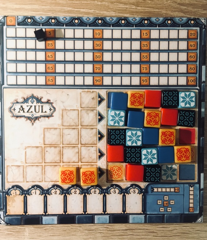 Во-первых, очень хочется рассказать о прошлых выходных, в которые азул продолжил своё восхождение на вершину популярности у нас дома. В субботу вечером я спросила мужа, не хочет ли он поиграть, он вроде согласился , и я быстро-быстро стала искать, чтобы интересное и недолгое предложить. На глаза попалась коробка с Хару Ичибан, в которую я играла только с детьми раньше. Принесла в комнату, но муж отверг сразу же, даже не захотел послушать о чем игра. Давай, говорит, в азул поиграем, который в отпуск брали. Вы не представляете, как я была рада услышать эти слова). Побежала скорее за коробкой, позвали дочку и три партии сыграли втроём. Что сказать, всё-таки с ребёнком, пусть даже десятилетним, игра выходит совершенно иной. Нашей торопыжке быстрее бы выложить горизонтальную линию, спешит она, торопится. А мы-то с мужем выстроили в головах долгоиграющую стратегию, собираем кто красные, кто синие плиточки, стараемся вертикальные полосы блюсти. А тут раз и через пять раундов игре конец. Разве так можно? Мало того, дочка ещё и выиграла по очкам. Объяснили, что можно действовать по-другому. Но дочка в ответ поясняет, что ей хочется быть быстрее. В общем, не понравилось мужу всё это безобразие. В третьей партии еле уговорили нашего мужчину дать нашей принципиальной девочке ещё один шанс и тут , видимо, из солидарности, наш кот вдруг прыгнул на дочкин планшет, все плитки слетели, слёз было сколько. Дочка обиделась и ушла спать, а мы с мужем проиграли аж до двух часов ночи. Наигрались так наигрались. Я была под впечатлением, потому что мой дорогой мужчина считает настольные игры детской забавой и играет с нами очень -очень редко, а тут после каждой партии безапелляционным тоном объявляет ещё одно сражение. Но это ещё не всё. Следующим вечером муж САМ предложил снова поиграть в азул. Честное слово, такого ещё никогда не было. У меня же были совершенно другие планы, нужно было форму выгладить, что-то ещё важное сделать, но , конечно, я всё бросила)). Сыграли три партии. Первые две мужу буквально с первых ходов не везло, штрафы достигали отметки максимум, он никак не мог сдвинуться с отметки 5 на шкале очков. А вот в третьей партии случилось невероятное, муж набрал 129 баллов к концу игру и побил все наши предыдущие рекорды. А я в этой же партии 104.