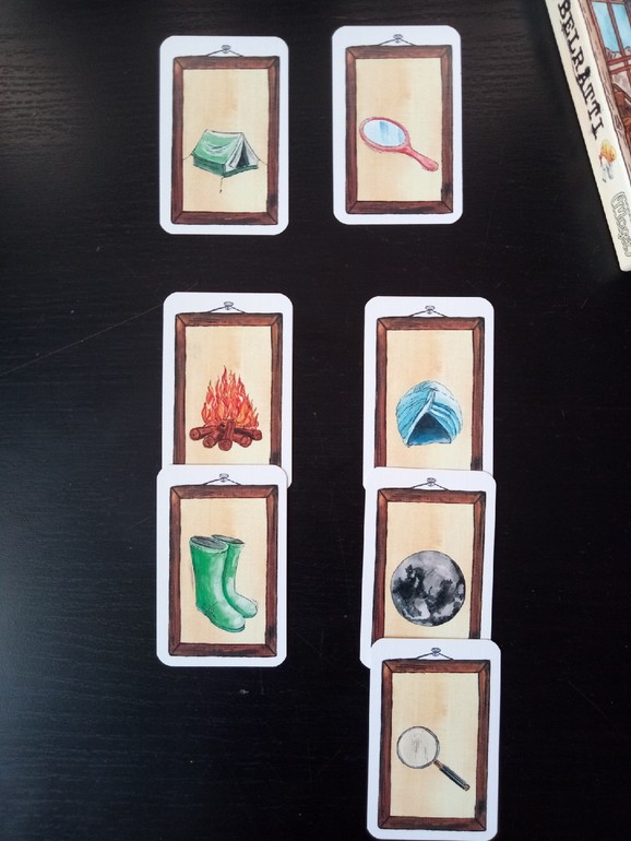 На картинке выше костёр, сапоги, луна и лупа угаданы верно (они идут в плюс всем игрокам), а чалму игрок-сова выложил, думая о том, что она похожа на палатку. Тема угадана неверно и карта уходит в сброс (но не к Бельратти).