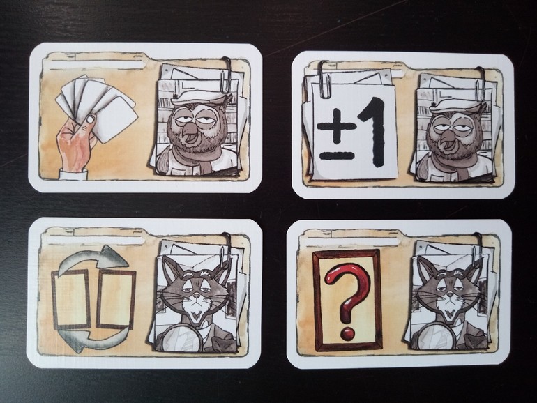 С их помощью можно поменять 6 карт с руки, изменить на один в ту или иную сторону число картин, озвученное котами, поменять одну или обе темы, узнать правду про одну из карт (не от Бельратти ли она). Когда игроки используют одну из карт, она переворачивается.